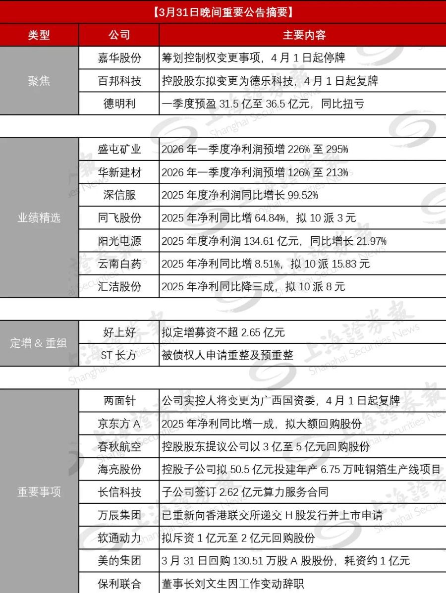 (备注:数据截至31日21:30,后续公告内容请下载上证报APP在快讯栏目查看;或在微信首页菜单“上证财讯”中查看。)