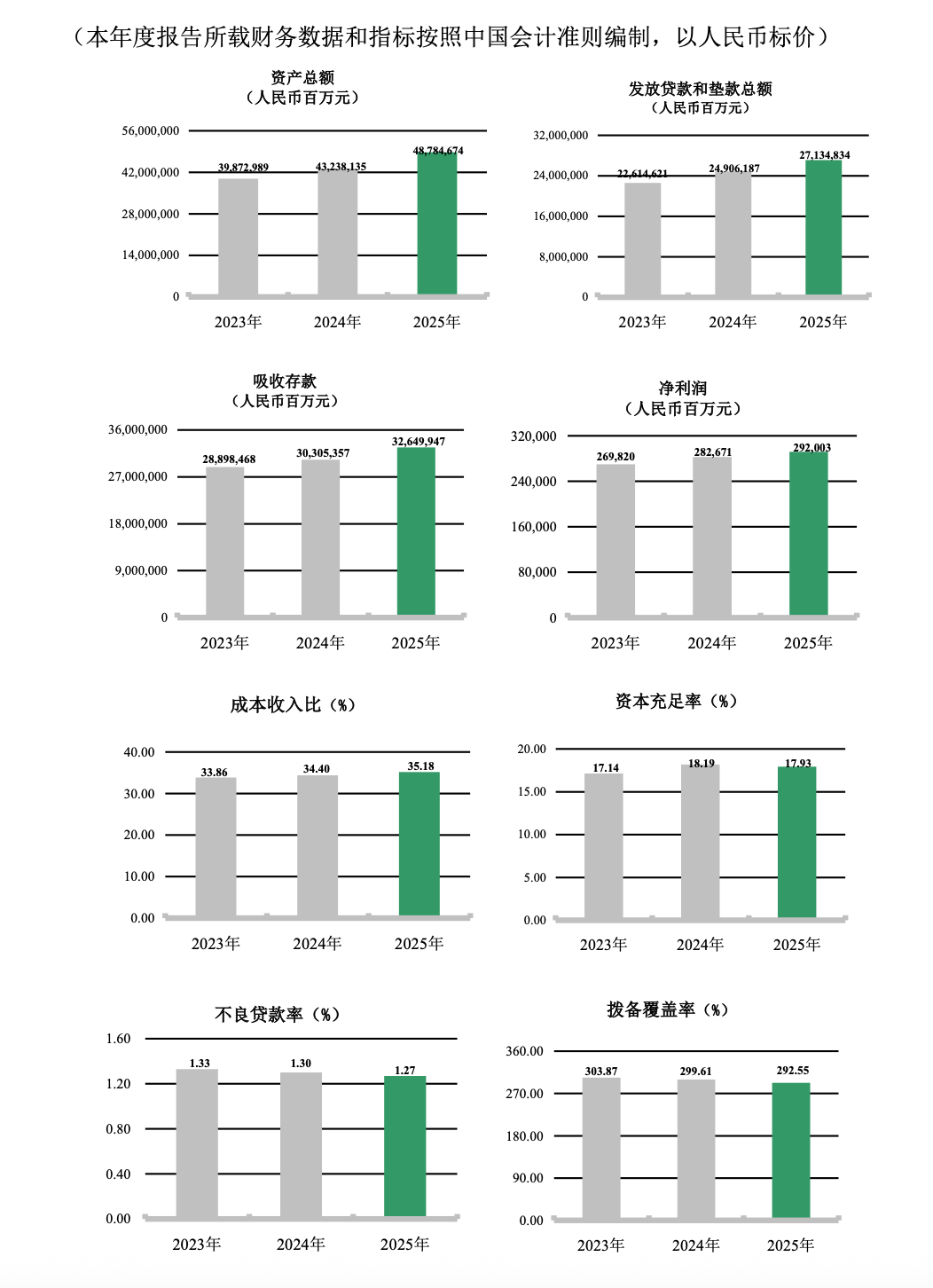 2025年,农业银行实现了效益与规模的同步提升。集团全年实现净利润2,920亿元,同比增长3.3%;实现营业收入7,253亿元,同比增长2.1%,延续了“双正增长”的良好势头。资本实力雄厚,资本充足率达到17.93%。截至报告期末,集团总资产规模达48.8万亿元,其中发放贷款和垫款总额27.13万亿元,较上年末新增2.23万亿元,增速为8.9%。负债端基础稳固,全口径客户存款余额38.69万亿元,新增3.71万亿元,存款稳定性持续提升。