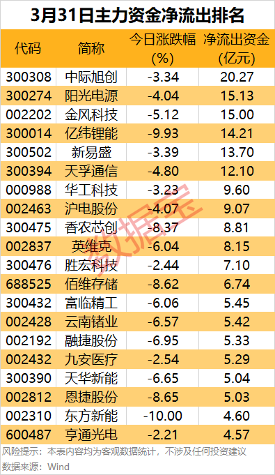 中际旭创净流出20.27亿元,居首,股价下跌3.34%。阳光电源、金风科技和亿纬锂能主力资金净流出均超14亿元。