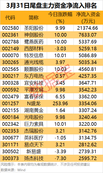 此外,神剑股份、鹭燕医药、西部材料、特发信息和通光线缆等尾盘主力资金净流入金额居前。