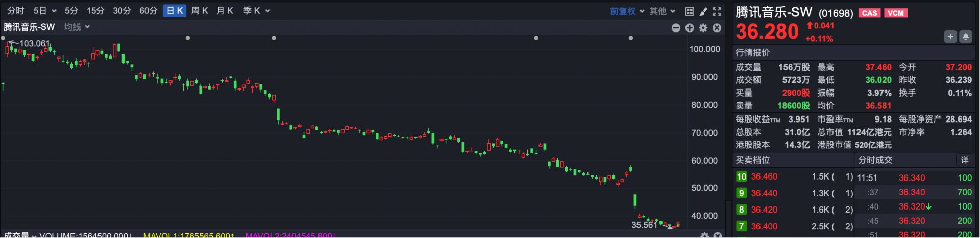 1.腾讯音乐-SW(HK01698):一季度跌幅46.75%。