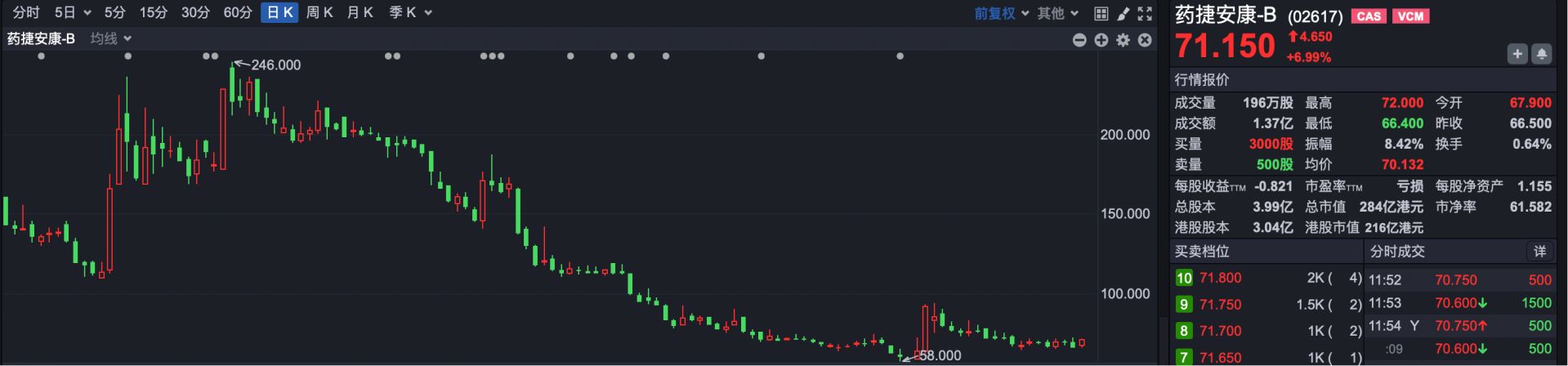 下跌原因:去年9月,药捷安康被疯狂爆炒,随后陷入大幅回撤;今年1月,该公司又再度配股融资约1.9亿港元。