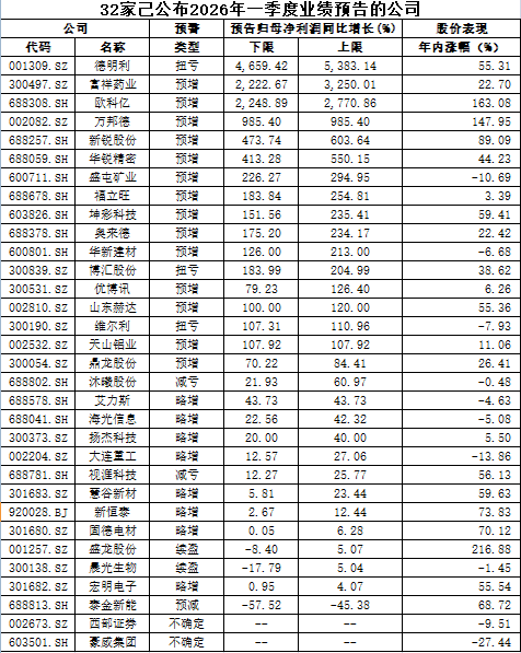 在业绩增长幅度方面,32家披露预告的公司中,高增长个股表现突出。其中,德明利(001309.SZ)、富祥药业(300497.SZ)、欧科亿(688308.SH)3家公司预计2026年一季度实现归属于上市公司股东的净利润同比增幅超10倍,分别达到5383.14%、3250.01%和2770.86%,成为一季度业绩增长的“领头羊”。