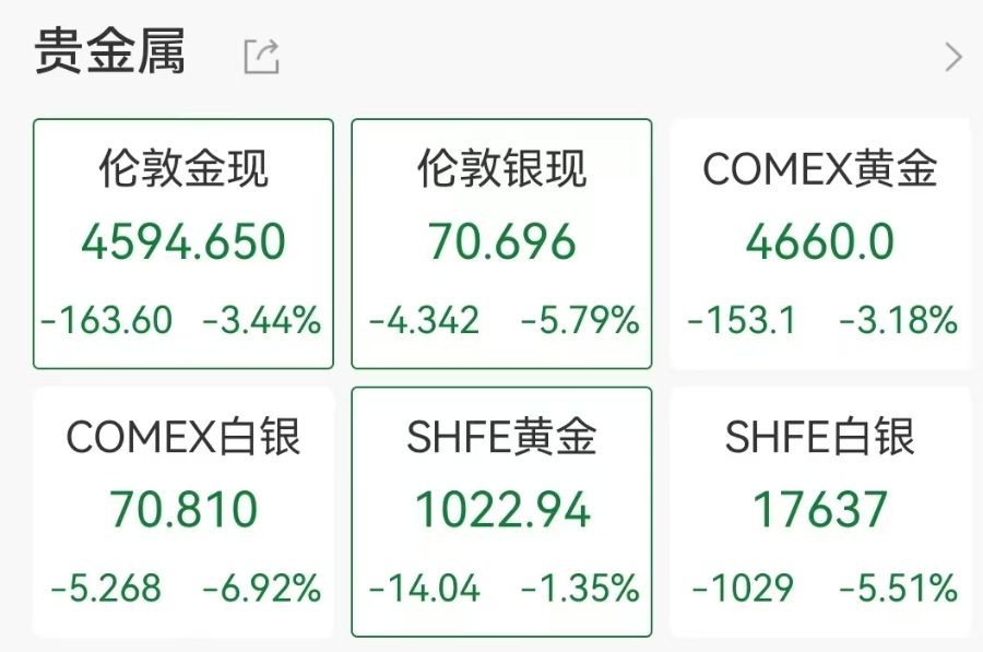 截至14:00,现货白银日内跌近6%,报70.696美元/盎司。现货黄金失守4600美元/盎司,跌幅超3%。