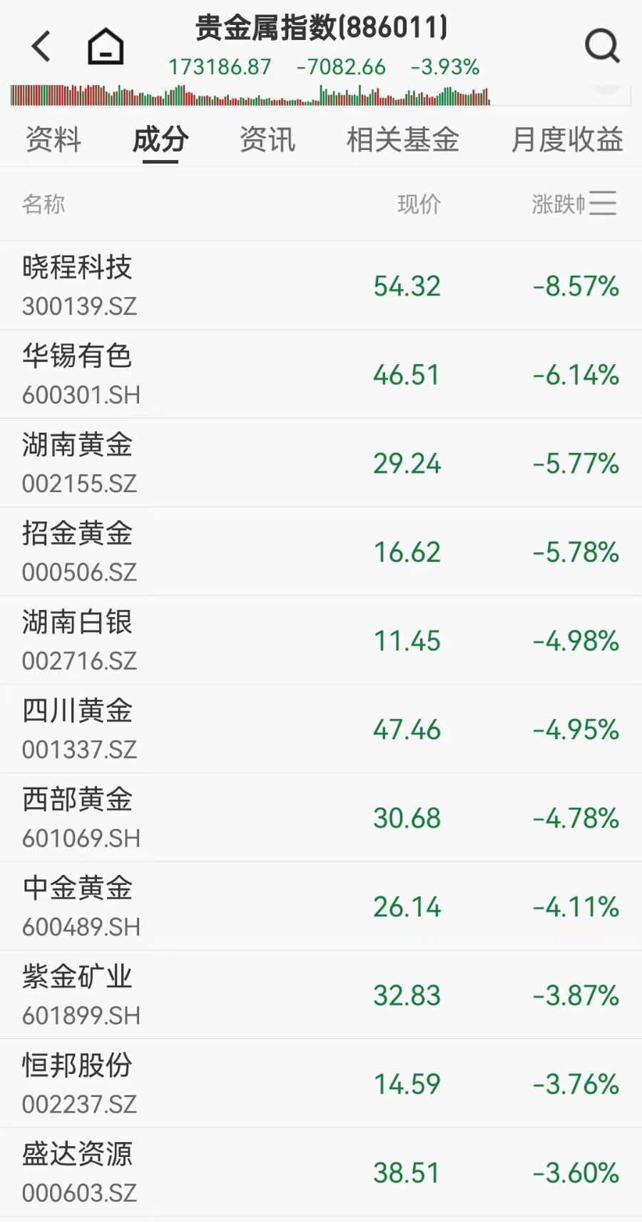 贵金属概念股大幅走低,晓程科技、华锡有色、湖南黄金、招金黄金等跌超5%。