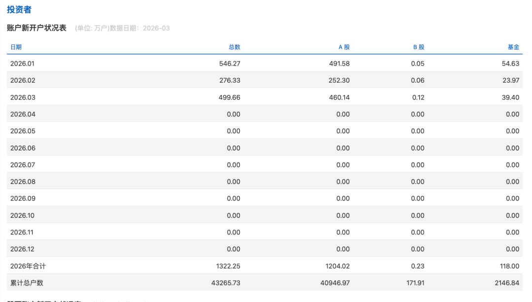 值得关注的是,3月新开户数高于2025年所有月份单月开户数,为2021年以来单月开户数第三高。总体来看,2026年第一季度(1-3月)合计新开户1204.02万户,较2025年同期的747.14万户增长61.15%。