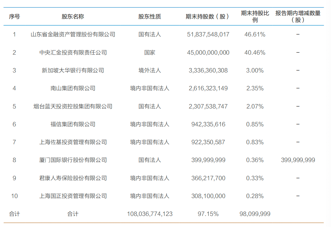 前十大股东情况还显示,目前山东省金融资产管理股份有限公司和中央汇金分别持有恒丰银行46.61%、40.46%股份。新加坡大华银行持股3%,为第三大股东。