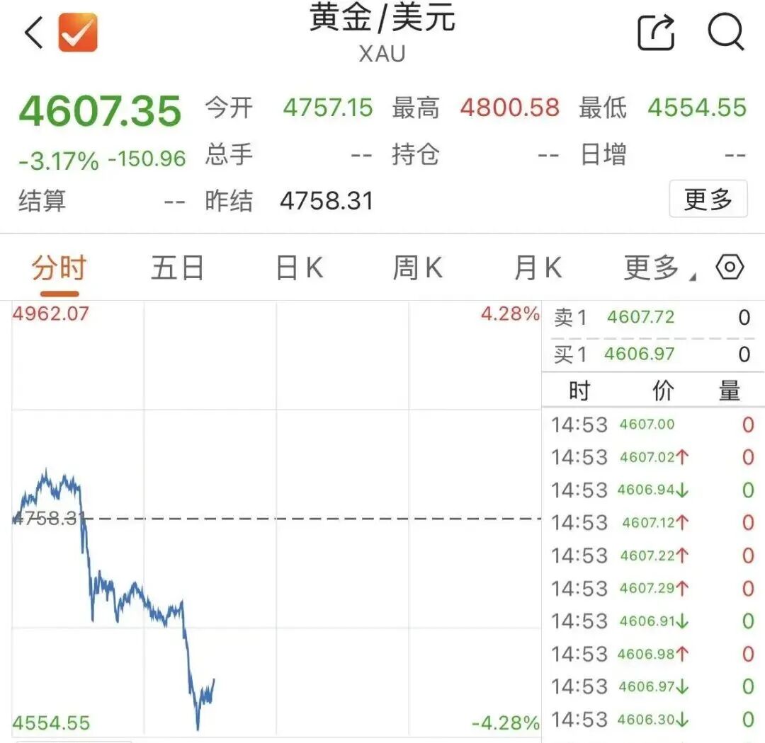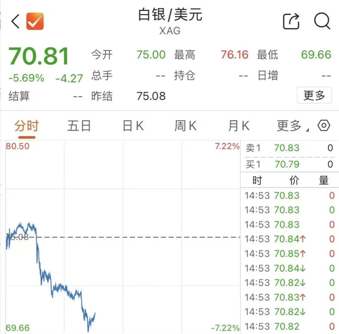 贵金属价格再度跳水。黄金现货价格一度跌超4%,跌破4600美元/盎司关口,截至发稿报4607.35美元/盎司,下跌3.17%。白银现货价格一度跌超7%,跌破70美元/盎司关口,截至发稿报70.81美元/盎司。
