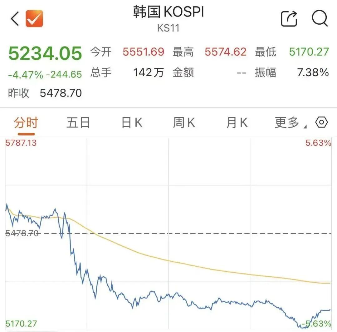 4月2日午后,日韩股市突发跳水。韩国KOSPI指数一度下挫至跌幅超5.6%,收盘跌幅4.47%,报5234.05点。KOSPI 200期货盘中下跌5%后,触发KOSPI指数熔断机制,程序化交易暂停5分钟。