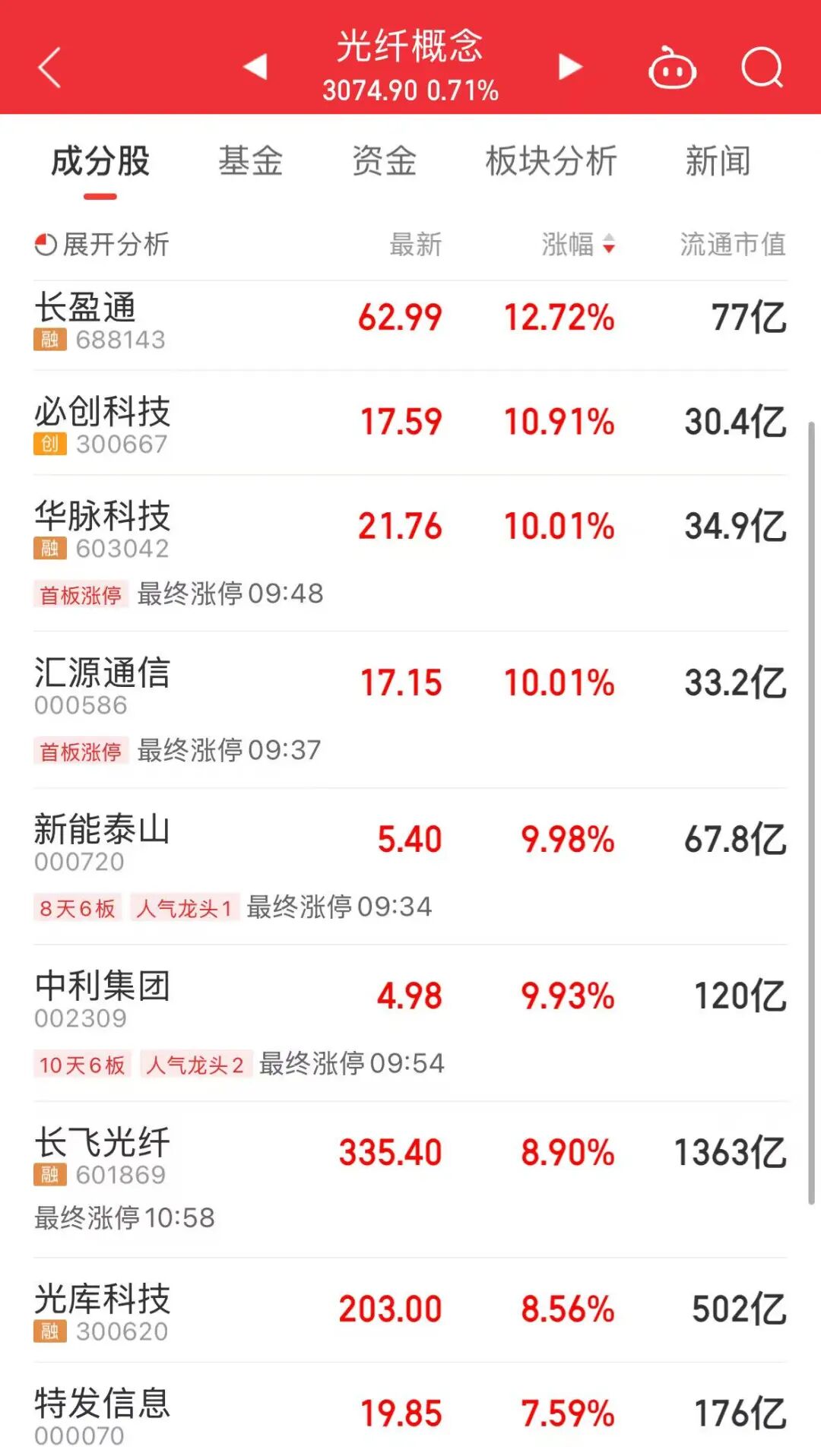 再来看光纤板块,今天上午,龙头股长飞光纤上涨8.9%,股价创历史新高,最新市值为2776.8亿元。亨通光电上涨5.06%,盘中股价也创历史新高。
