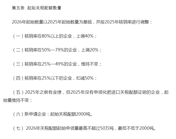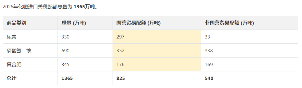 2025年10月16日,商务部《2026年化肥进口关税配额总量、分配原则及相关程序》,明确2026年化肥进口关税配额总量为1365万吨,其中尿素配额为330万吨。