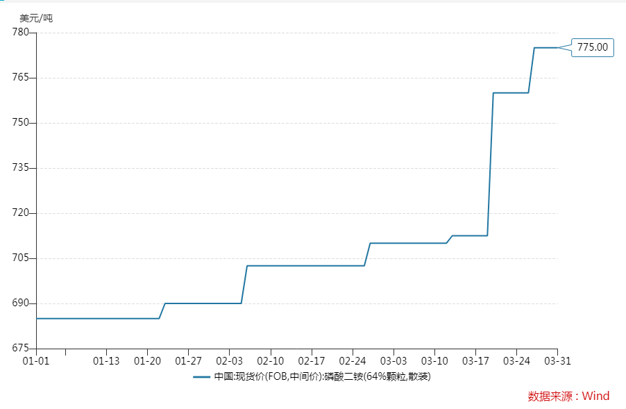 以最主要的氮肥尿素为例,隆众资讯数据显示,截至3月31日,中国尿素现货(FOB,中间价)达到752.5美元/吨,较年初时的390美元/吨上涨92.8%。