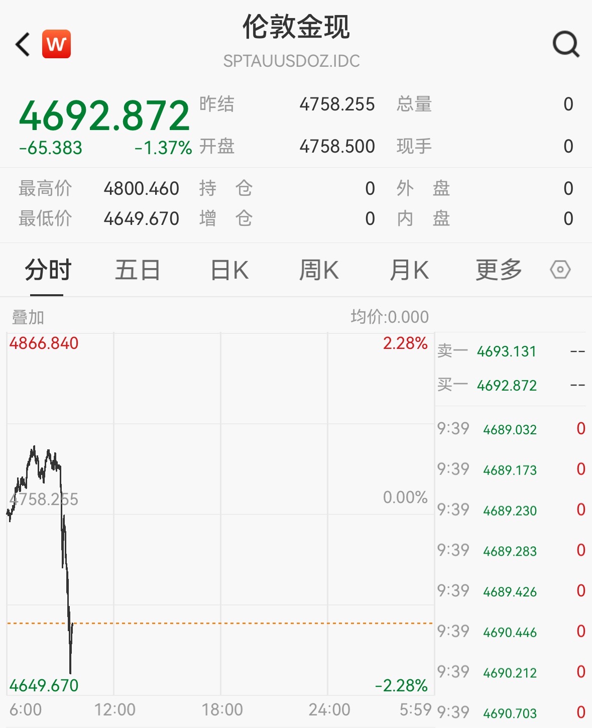 北京时间4月2日,现货黄金盘中突然跳水由红转绿,截至9:39,跌超1%,报4692.87美元/盎司,布油直线拉升,一度站上106美元关口,目前大涨超4%,报105.31美元。