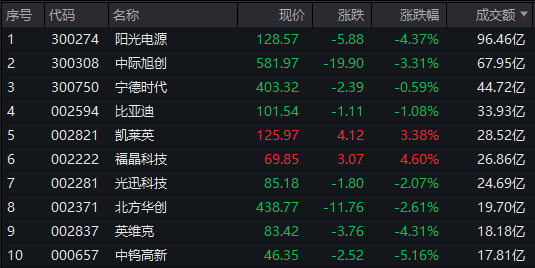 个股方面,阳光电源半日成交额超96亿元居首,中际旭创、宁德时代、比亚迪成交额靠前。