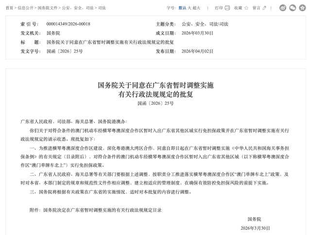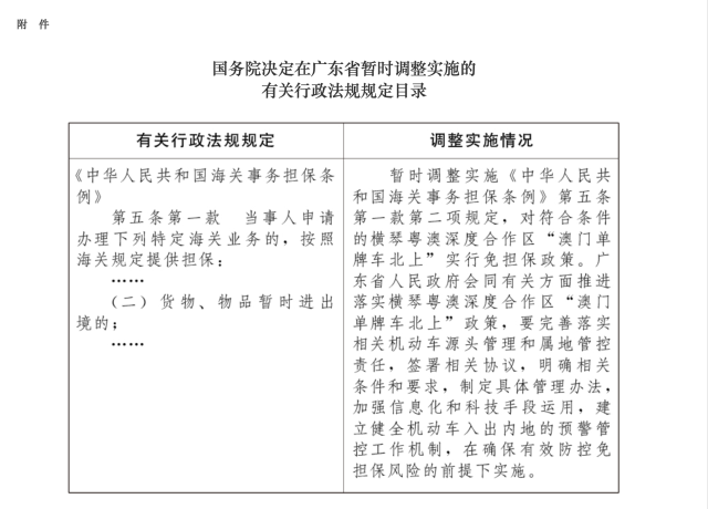 4月2日,中国政府网发布《国务院关于同意在广东省暂时调整实施有关行政法规规定的批复》。即日起,对符合条件的横琴粤澳深度合作区“澳门单牌车北上”实行免担保政策。《批复》要求有关部门要根据上述调整,按职责分工推进落实横琴粤澳深度合作区“澳门单牌车北上”政策。