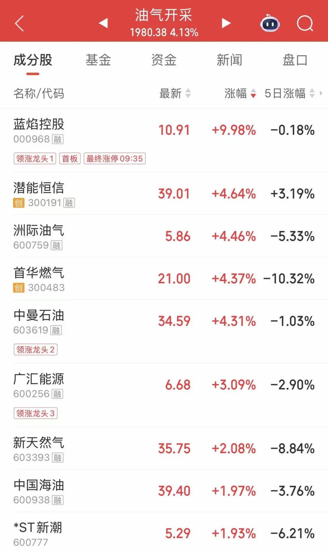 油气开采板块持续上扬,蓝焰控股、贝肯能源涨停,中曼石油、广汇能源、洲际油气、新天然气、中国海油等纷纷走高。