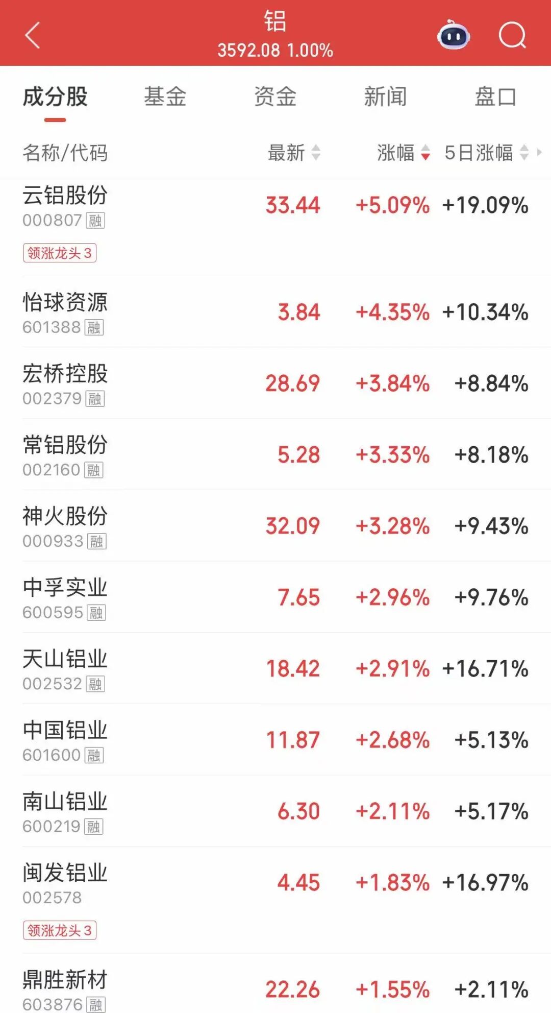 电解铝板块走高,云铝股份、 怡球资源、 宏桥控股涨幅居前。消息面上,隔夜美股铝业板块普涨,受中东最大铝企遭导弹袭击停产影响,美国铝业、世纪铝业(股价创历史新高)涨超8%。