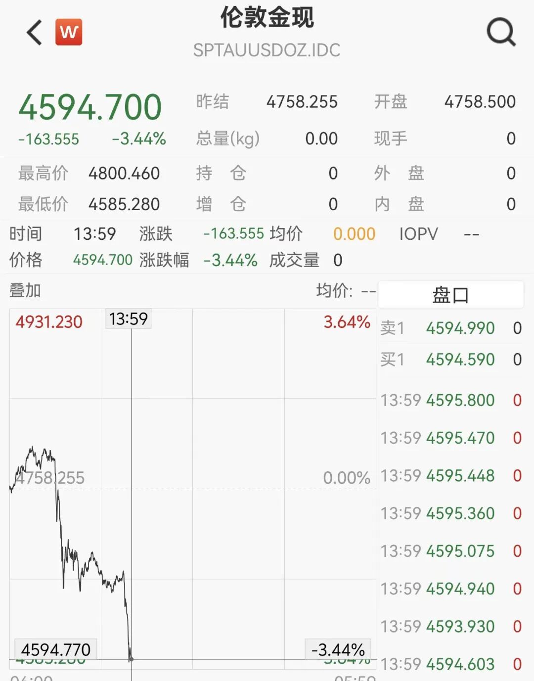 4月2日午后,现货黄金失守4600美元/盎司,一度低探至4585美元/盎司,日内跌3.44%,跌幅超160美元。纽约期金失守4620美元/盎司,日内跌4.05%。