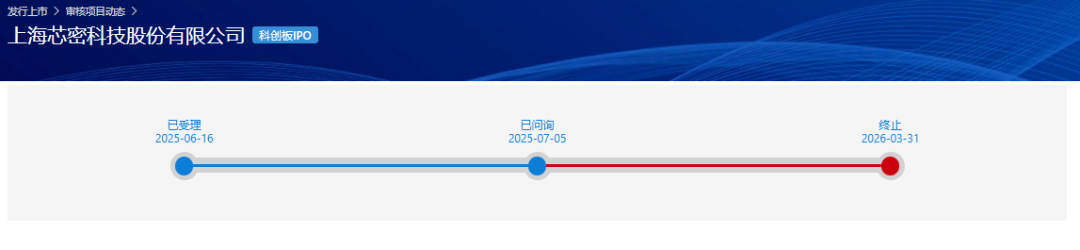 近日,上交所官网显示,因上海芯密科技股份有限公司(下称:“芯密科技”)主动撤回发行上市申请,上交所决定终止其首次公开发行股票并在科创板上市的审核。