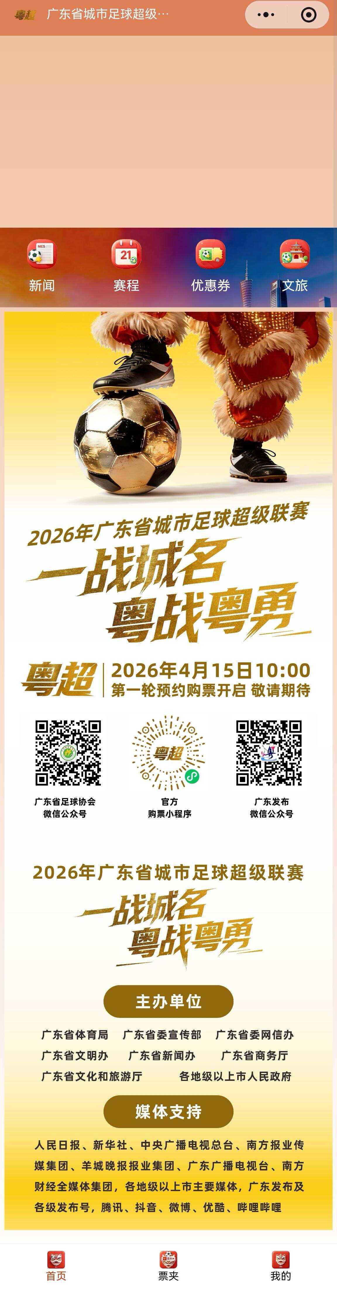 官方购票小程序“2026年广东省城市足球超级联赛”集赛事信息、票务服务、文旅体验于一体,共设预约购票、赛程、新闻、文旅、优惠券五大板块,小程序中提供全赛区、全场次门票预约功能,展示全省21个赛区各轮赛程,集中发布球队动态、官方公告等内容。