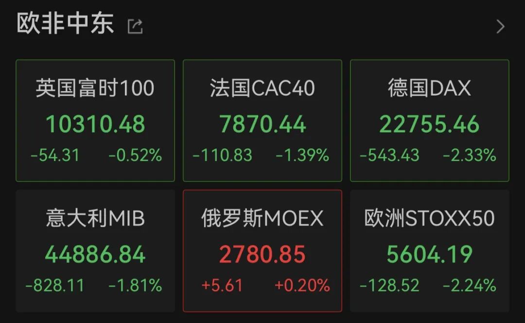 欧洲主要股市走弱。北京时间4月2日21:28,英国富时100指数跌0.52%,法国CAC40指数跌1.39%,德国DAX指数跌2.33%,意大利MIB指数跌1.81%,欧洲STOXX50指数跌2.24%。