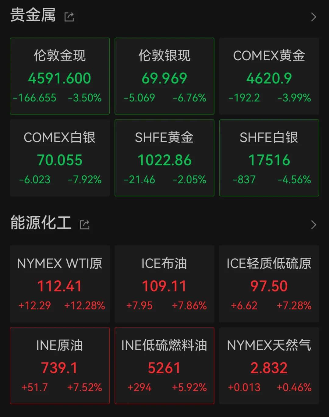 伦敦金现货价格 跌3.5%,报4591.6美元/盎司;COMEX黄金期货价格跌3.99%,报4620.9美元/盎司。