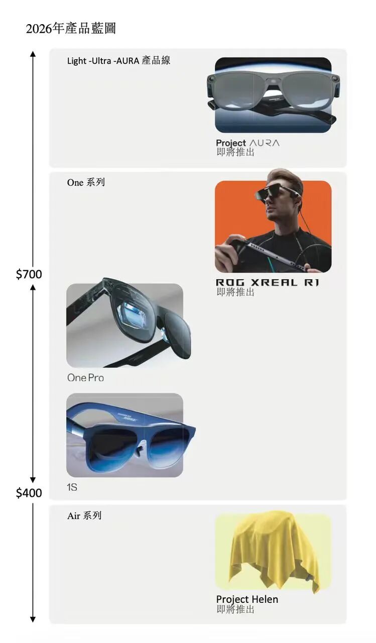 2026年,XREAL将进一步完善产品布局,计划推出面向大众市场的普及型眼镜Project Helen;与顶级电竞品牌ROG(玩家国度)合作,专为游戏发烧友打造的专业电竞眼镜R1,具备全球首款240Hz超高刷新率显示;以及与谷歌共同开发的下一代旗舰XR产品Project Aura。