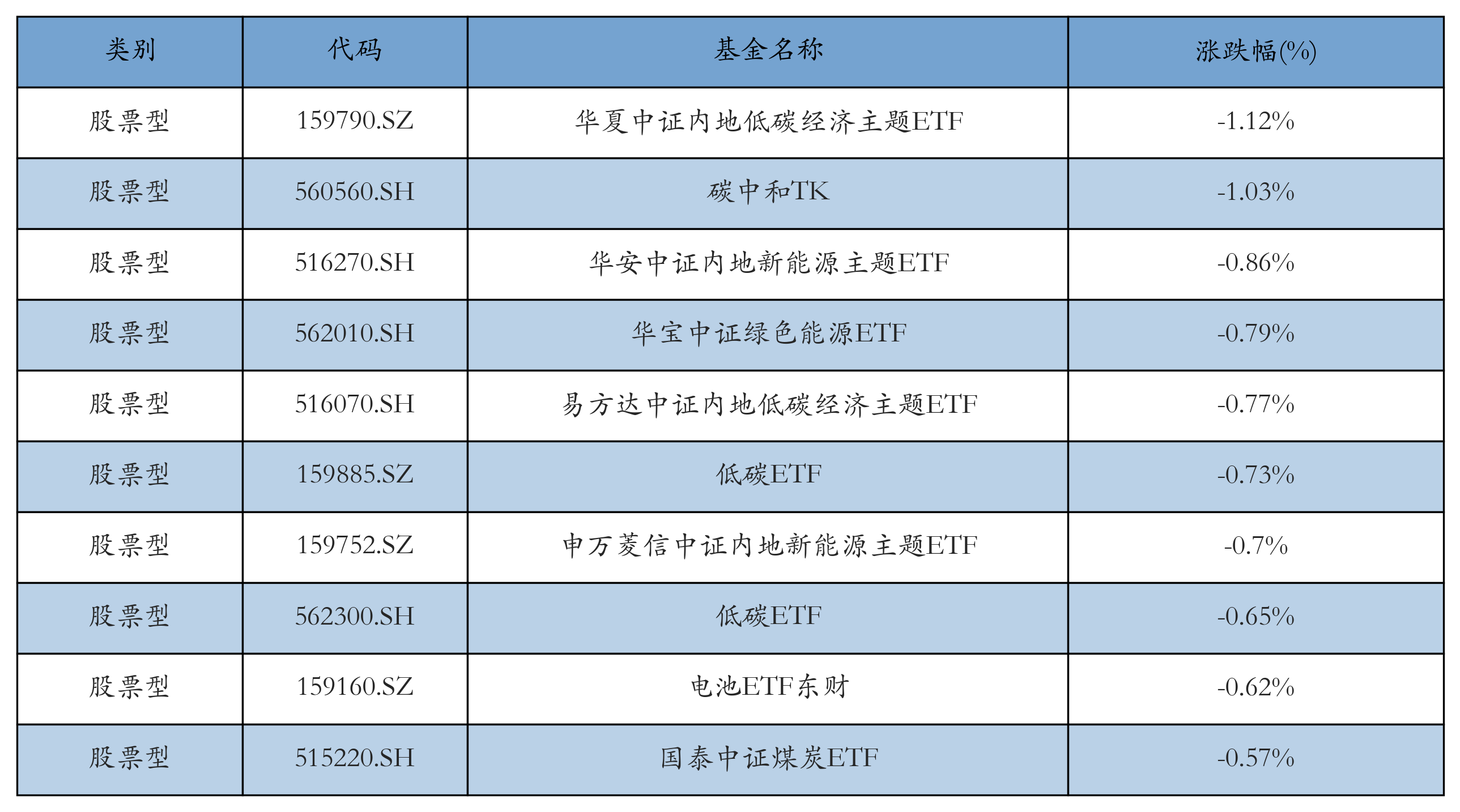 昨日股票型ETF跌幅最大的3只ETF及其收益率分别为:华夏中证内地低碳经济主题ETF(-1.12%)、碳中和TK(-1.03%)、华安中证内地新能源主题ETF(-0.86%)。跌幅前10详情见下表: