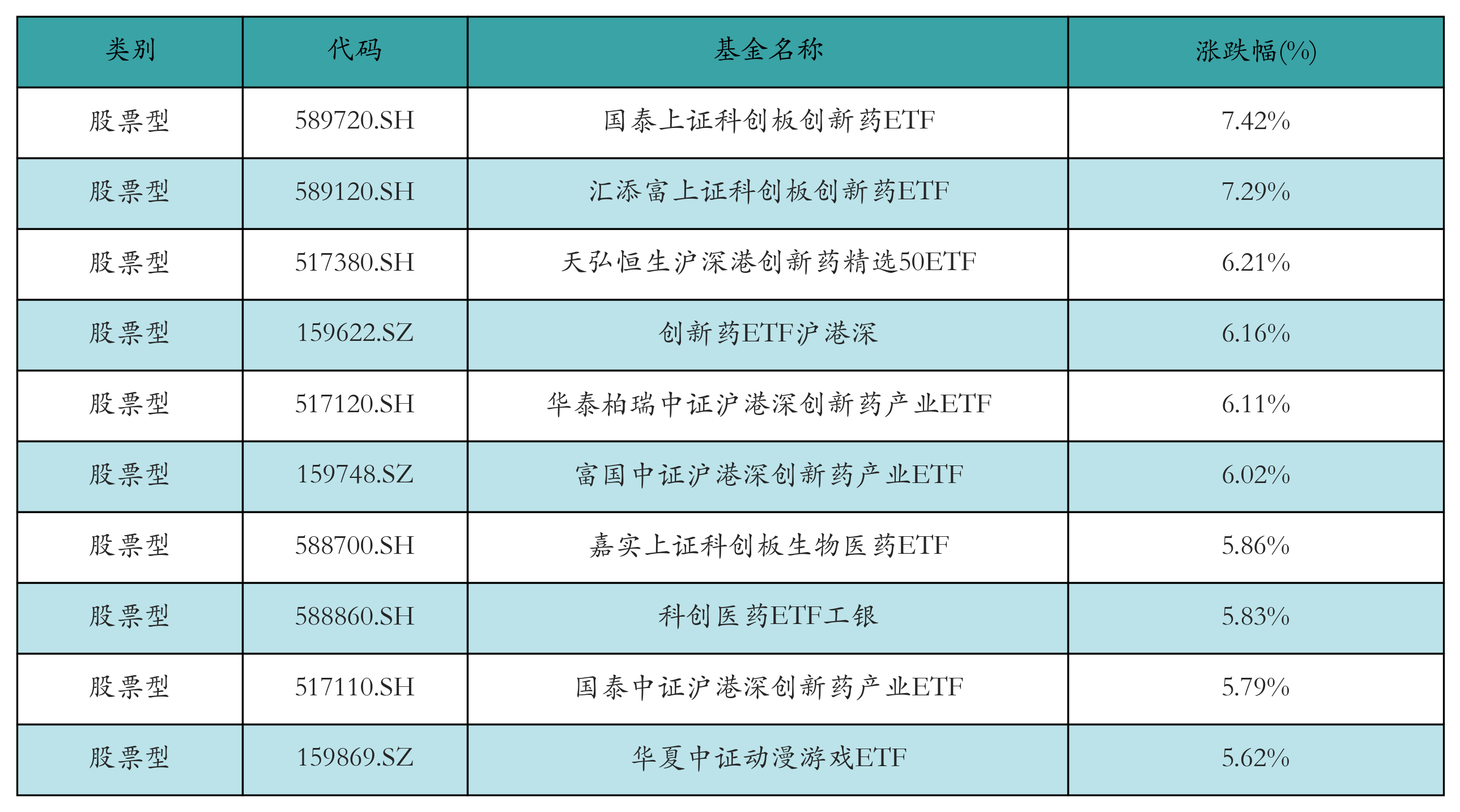 昨日股票型ETF涨幅最高的3只ETF及其收益率分别为:国泰上证科创板创新药ETF(7.42%)、汇添富上证科创板创新药ETF(7.29%)、天弘恒生沪深港创新药精选50ETF(6.21%)。涨幅前10详情见下表: