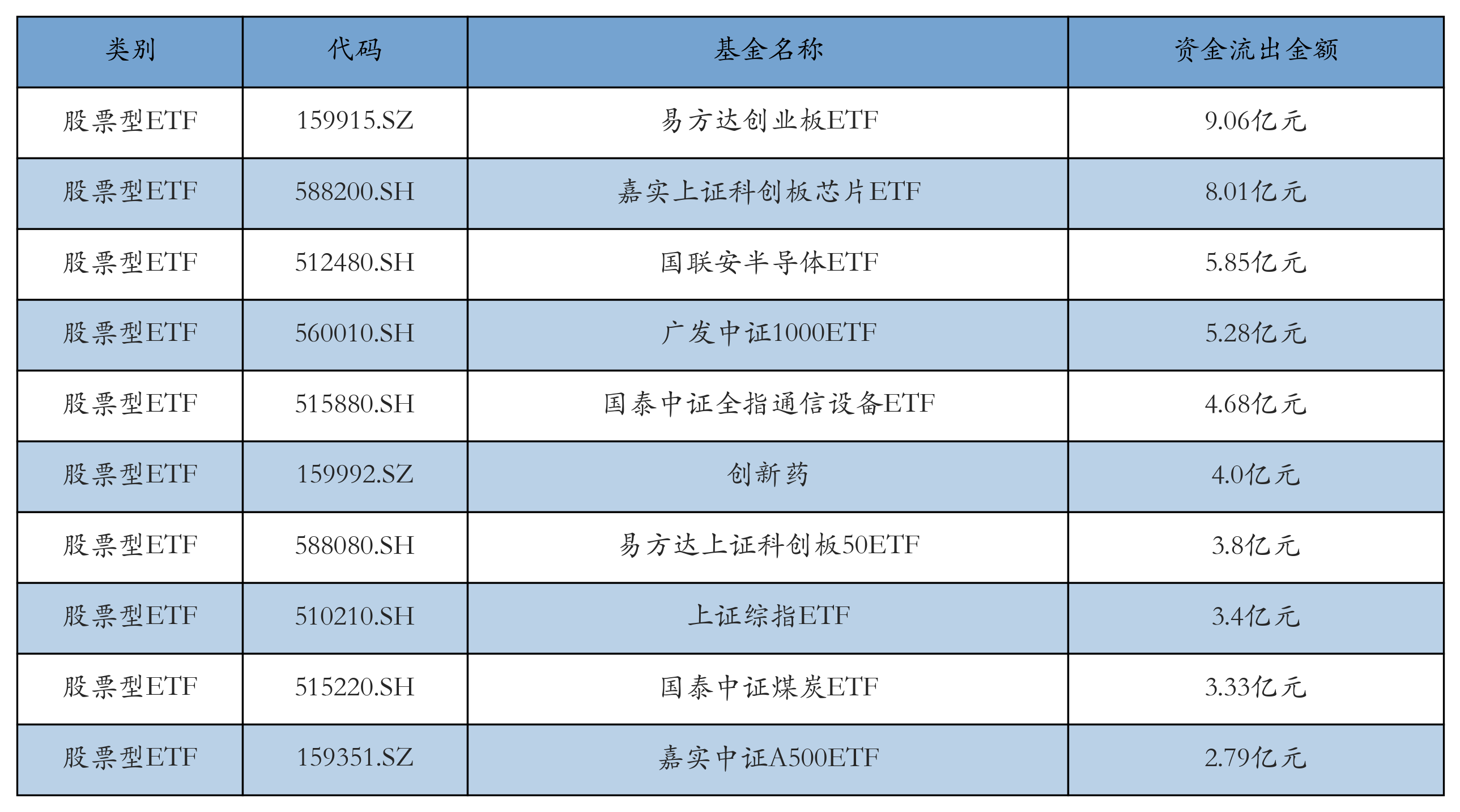 昨日股票型ETF资金流出最多的3只ETF及其流出金额分别为:易方达创业板ETF(流出9.06亿元)、嘉实上证科创板芯片ETF(流出8.01亿元)、国联安半导体ETF(流出5.85亿元)。资金流出前10详情见下表: