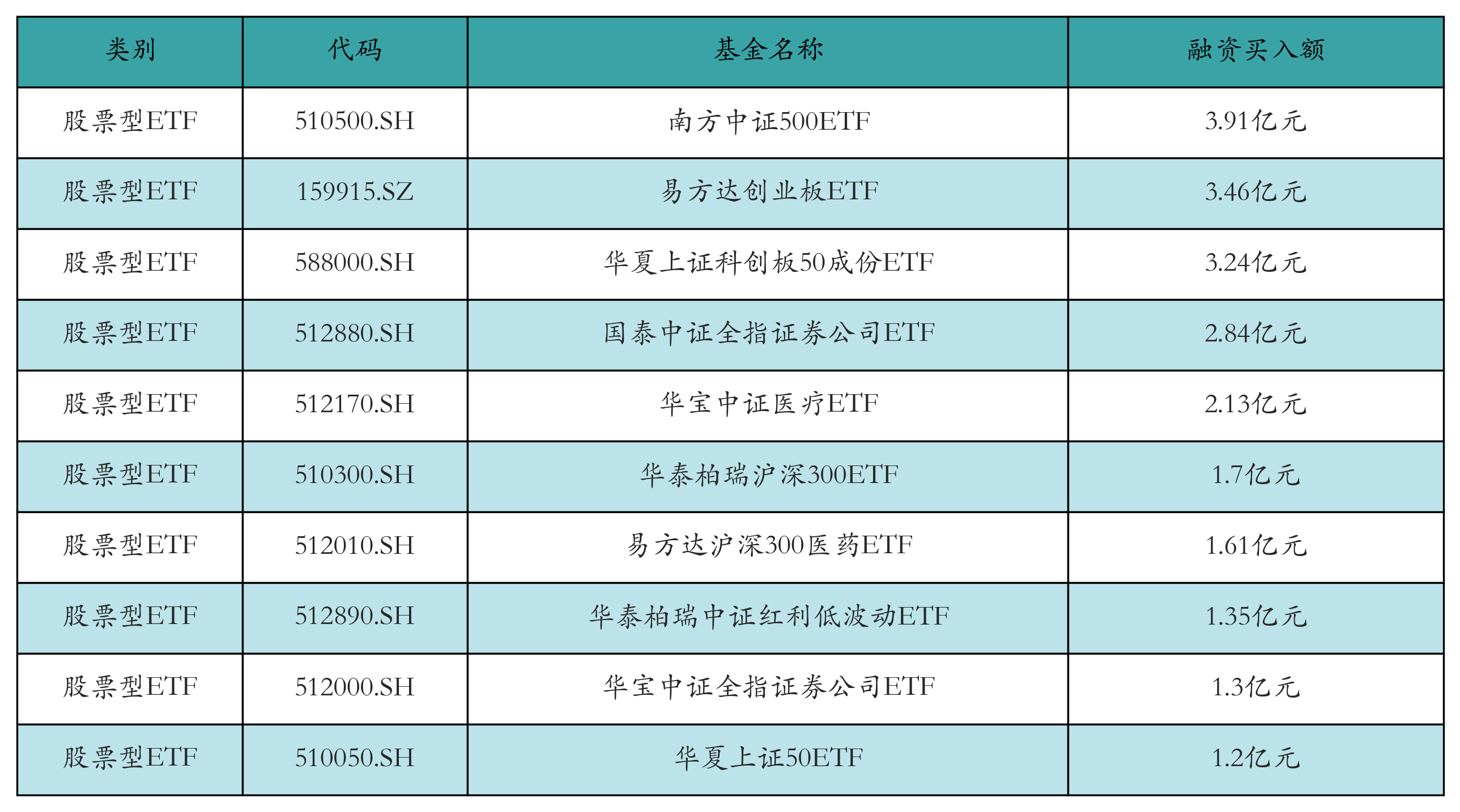 昨日股票型ETF融资买入额最高的3只ETF及其买入金额分别为:南方中证500ETF(3.91亿元)、易方达创业板ETF(3.46亿元)、华夏上证科创板50成份ETF(3.24亿元)。融资买入额前10详情见下表: