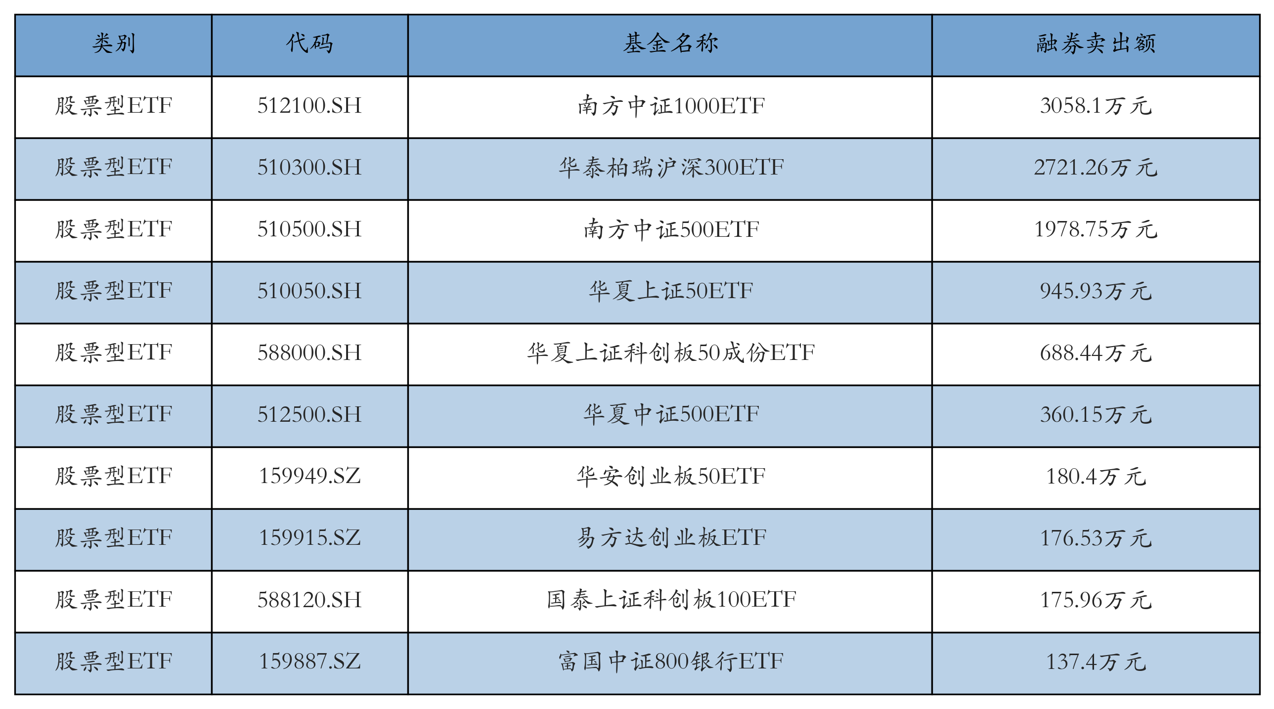 昨日股票型ETF融资卖出额最高的3只ETF及其卖出金额分别为:南方中证1000ETF(3058.1万元)、华泰柏瑞沪深300ETF(2721.26万元)、南方中证500ETF(1978.75万元)。融券卖出额前10详情见下表: