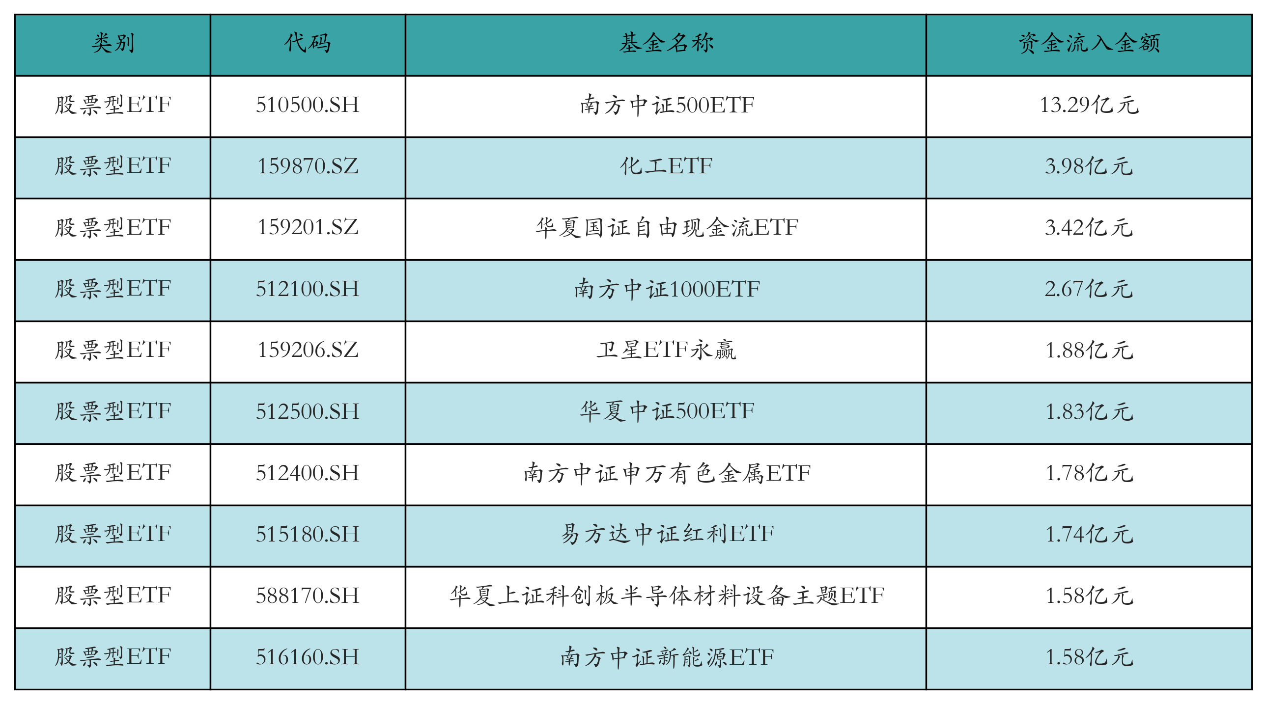 昨日股票型ETF资金流入最多的3只ETF及其流入金额分别为:南方中证500ETF(流入13.29亿元)、化工ETF(流入3.98亿元)、华夏国证自由现金流ETF(流入3.42亿元)。资金流入前10详情见下表: