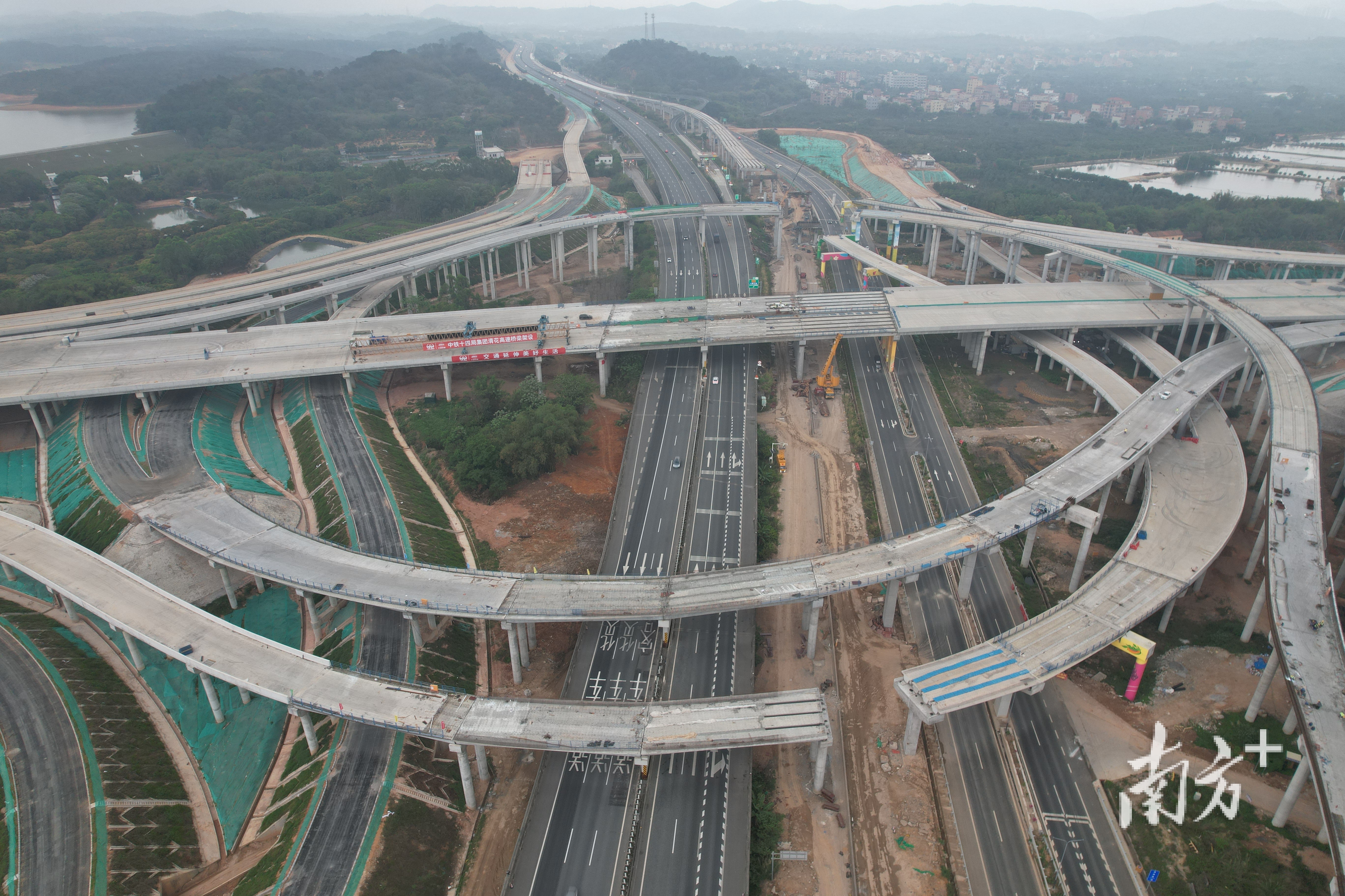 连珠枢纽互通主线桥合龙,清花高速广州段主线贯通。 通讯员供图