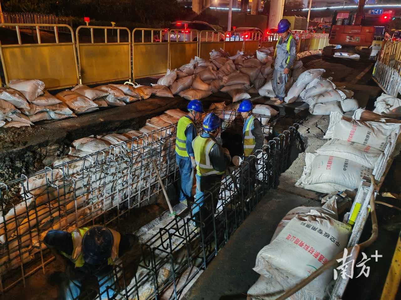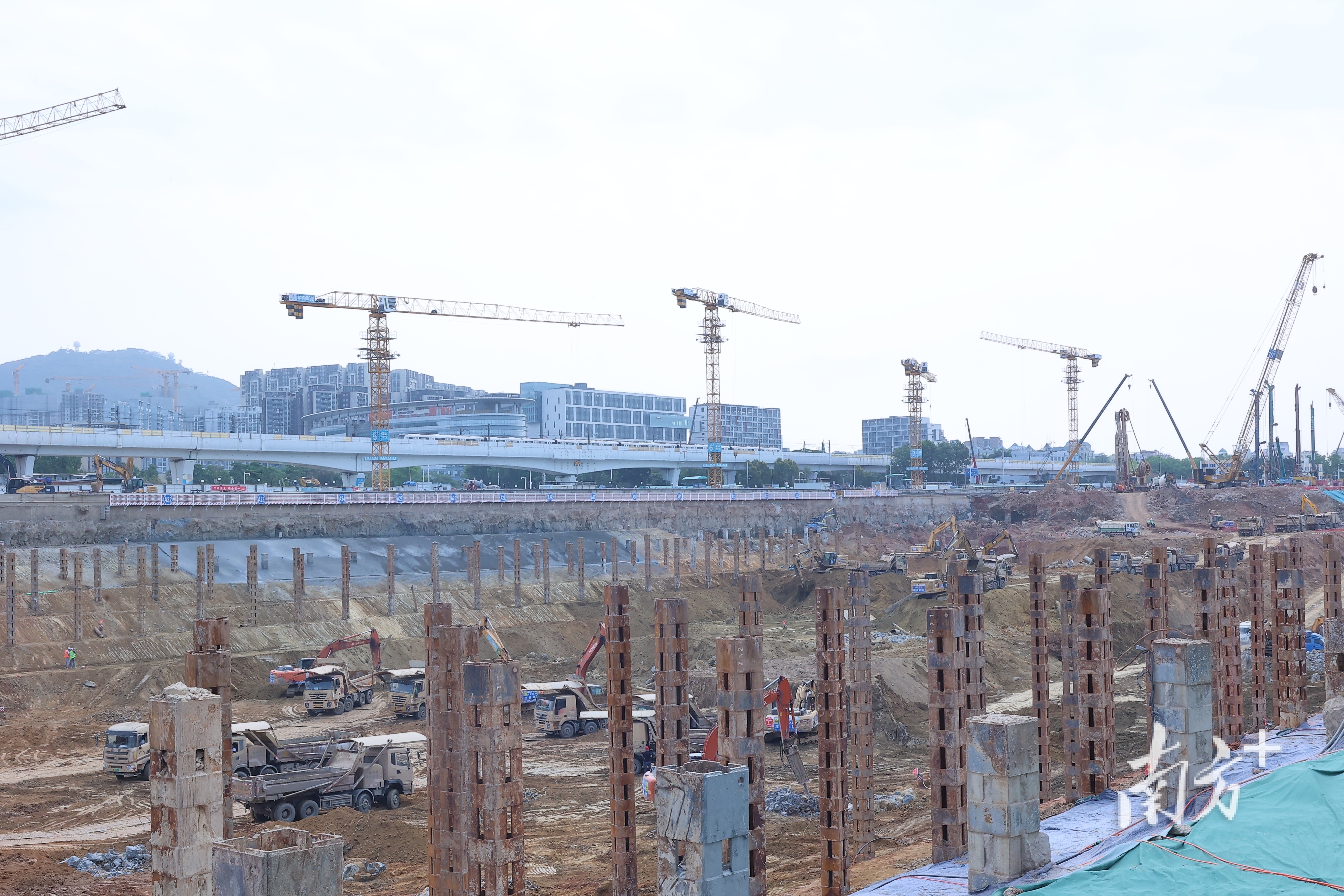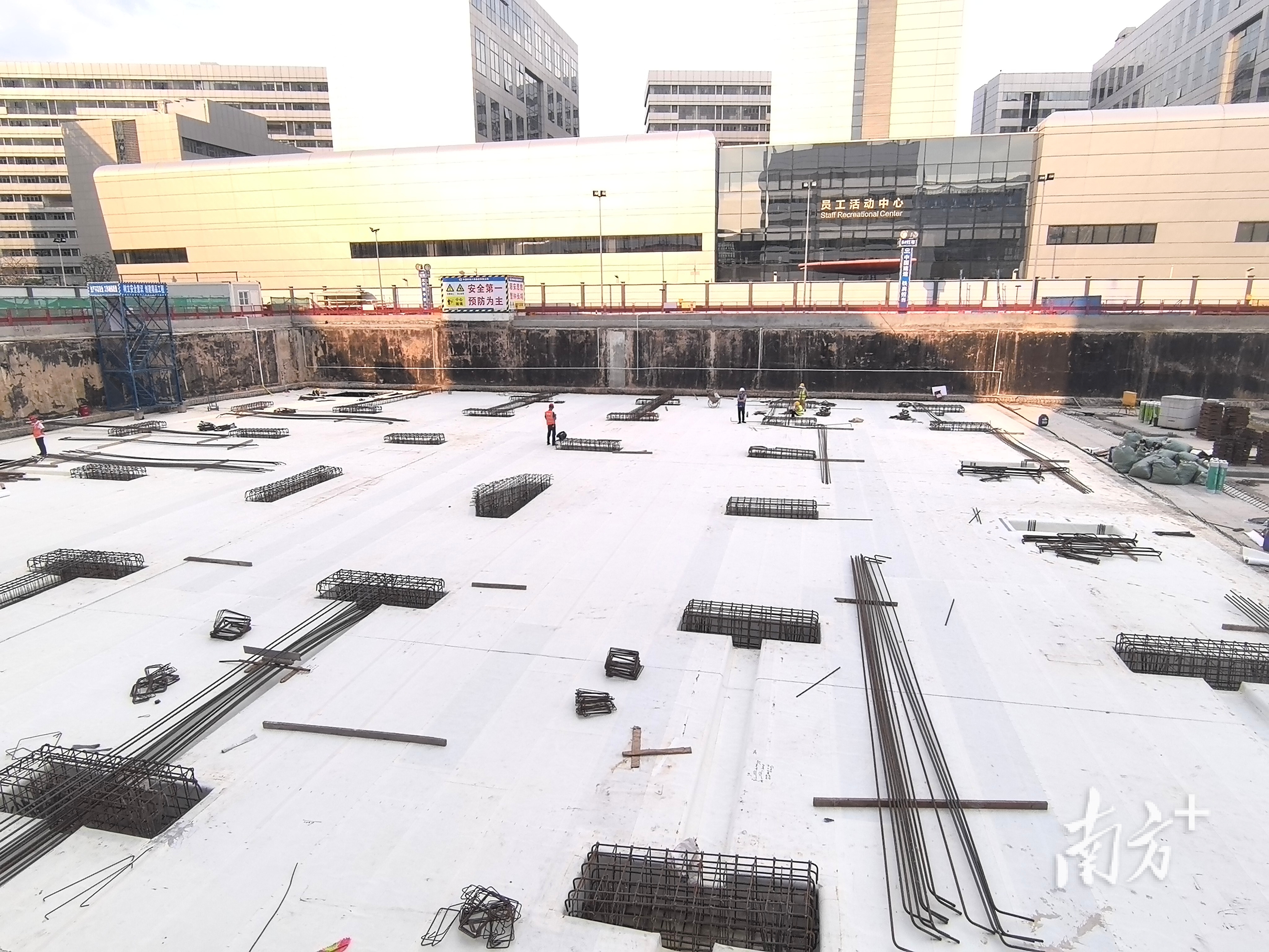 深江铁路深圳机场东站中心岛首段基坑见底,首块底板垫层浇筑完成。 通讯员供图