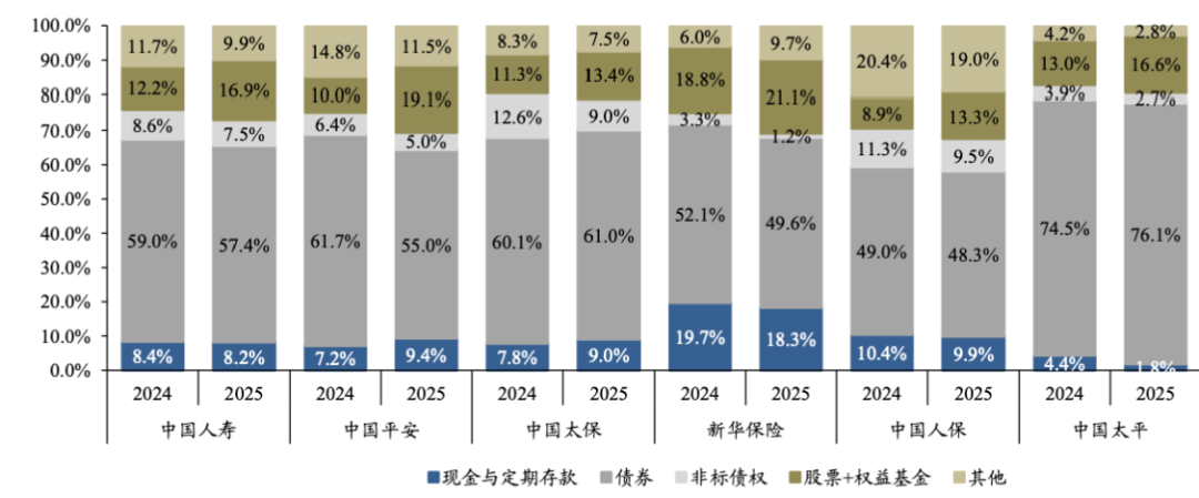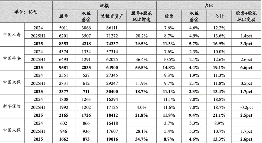 市场最为关注的是,较2024年,上市险企权益资产仓位普遍明显提升。从资产配置结构看,上市险企的债券投资规模仍在增长,同时普遍大幅增配股票和权益基金。