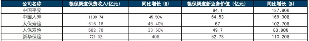 年报数据显示,中国人寿的银保渠道有效发挥战略发展作用,总保费首次突破千亿元;中国平安寿险及健康险业务银保新业务价值同比增长138%,中国太保、中国人保、新华保险银保新业务价值同比翻倍。