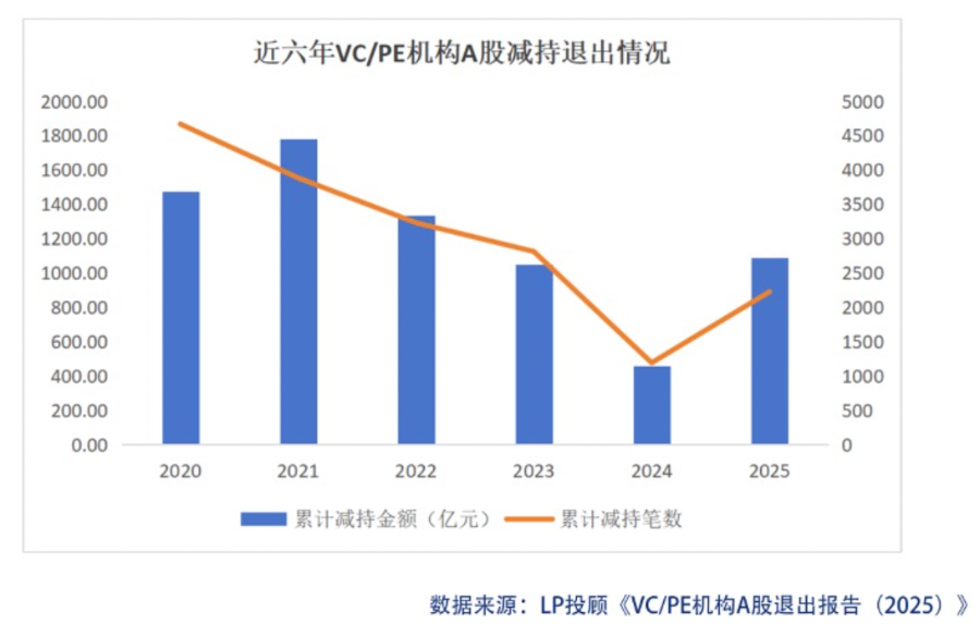 经历2021年减持高点后,VC/PE机构A股减持退出连续三年回落。到2025年,这一局面终于出现明显变化。