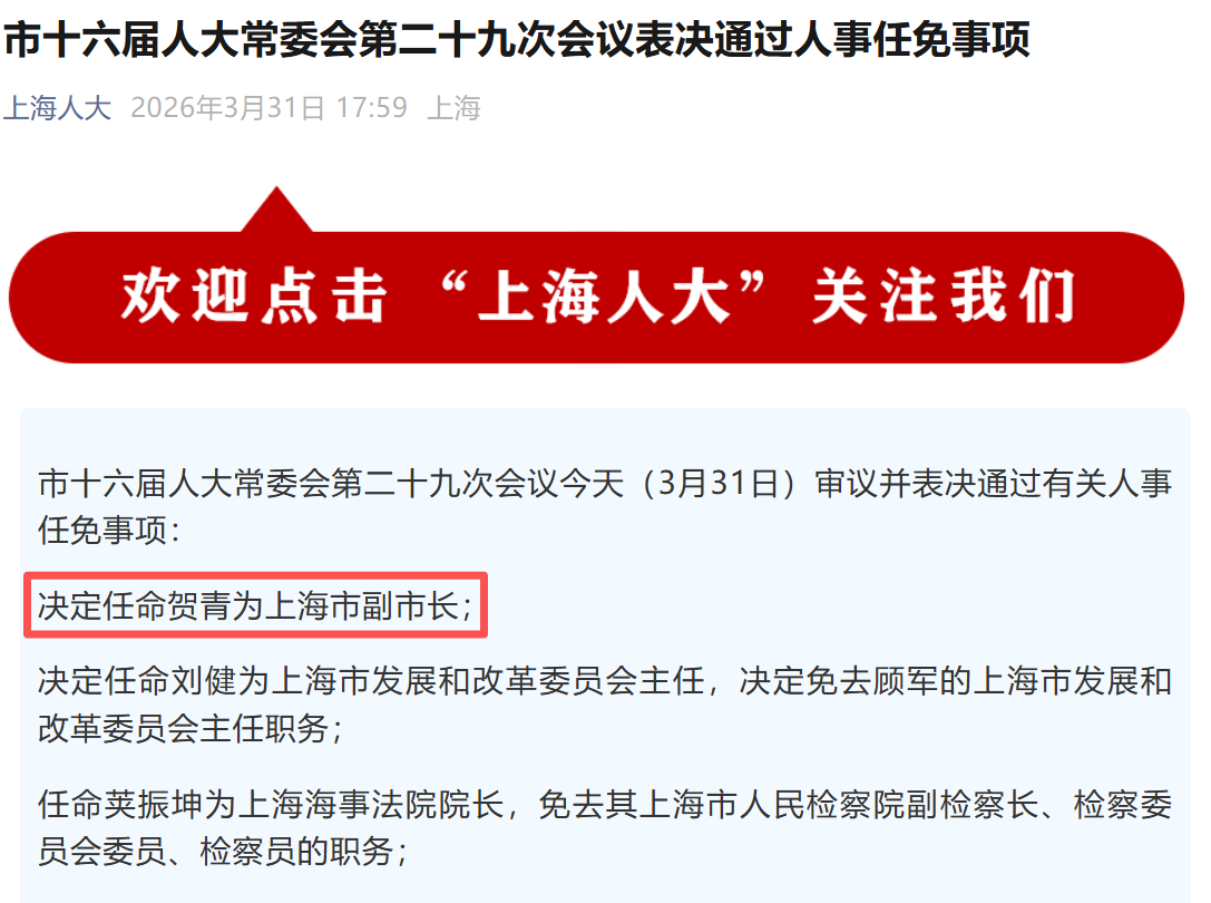 根据“上海发布”消息,3月31日,经上海市十六届人大常委会第二十九次会议决定,任命贺青为上海市副市长。