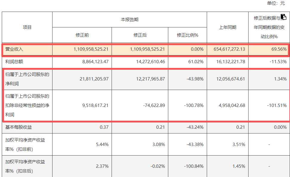公司多项利润指标则大幅下修。修正前,公司归母净利润为2181.12万元,修正后直接调整为1221.80万元,调整幅度达-43.98%,与上年同期的1205.67万元相比,仅微增1.34%,近乎原地踏步;原本盈利951.86万元的扣非净利润,修正后变为-7.46万元,调整幅度达-100.78%,直接由盈转亏。