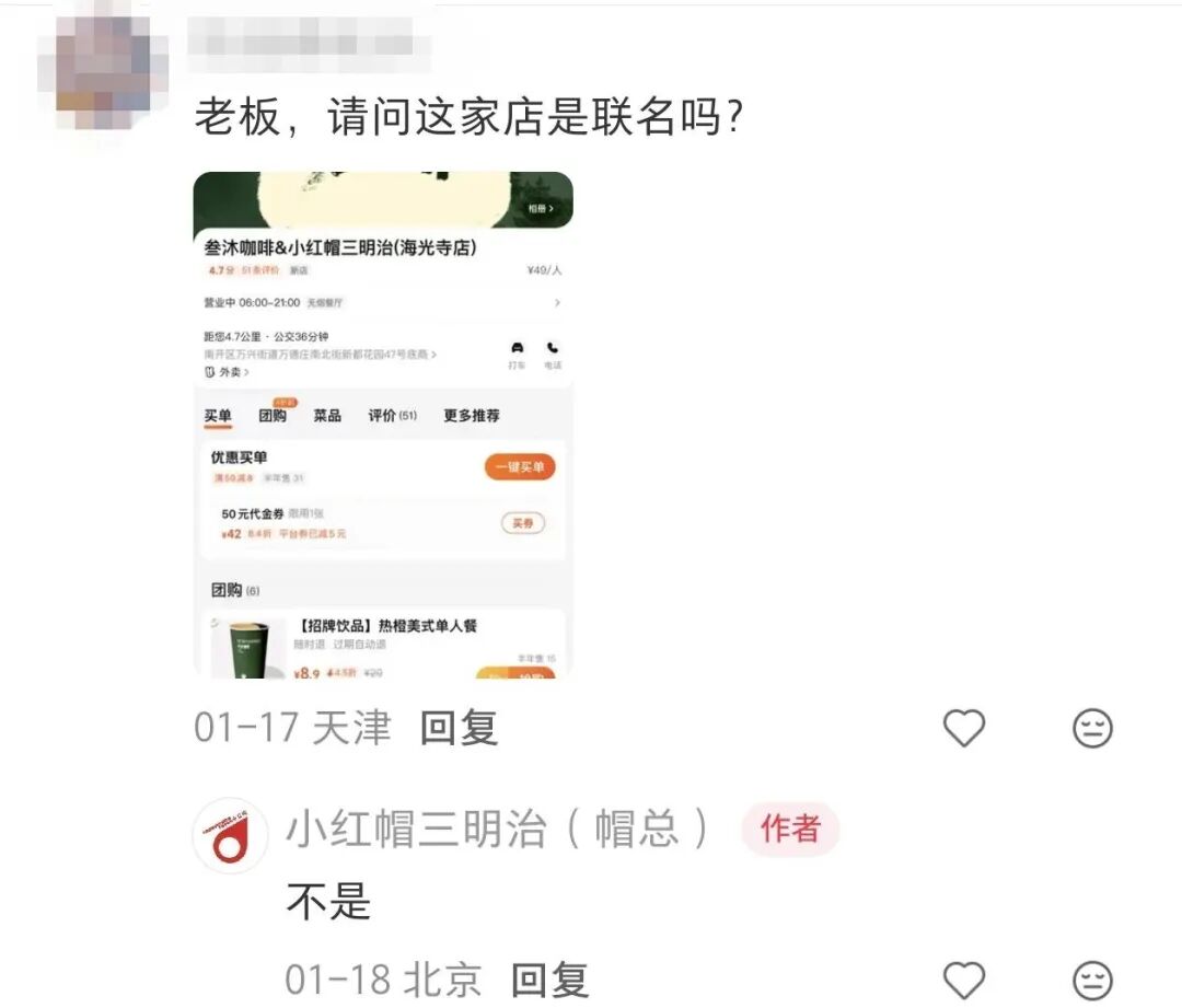 还有网友截图一家名为“叁沐咖啡&小红帽三明治(海光寺店)”的门店,问帽总是否是联名。帽总明确回复称:“不是”。