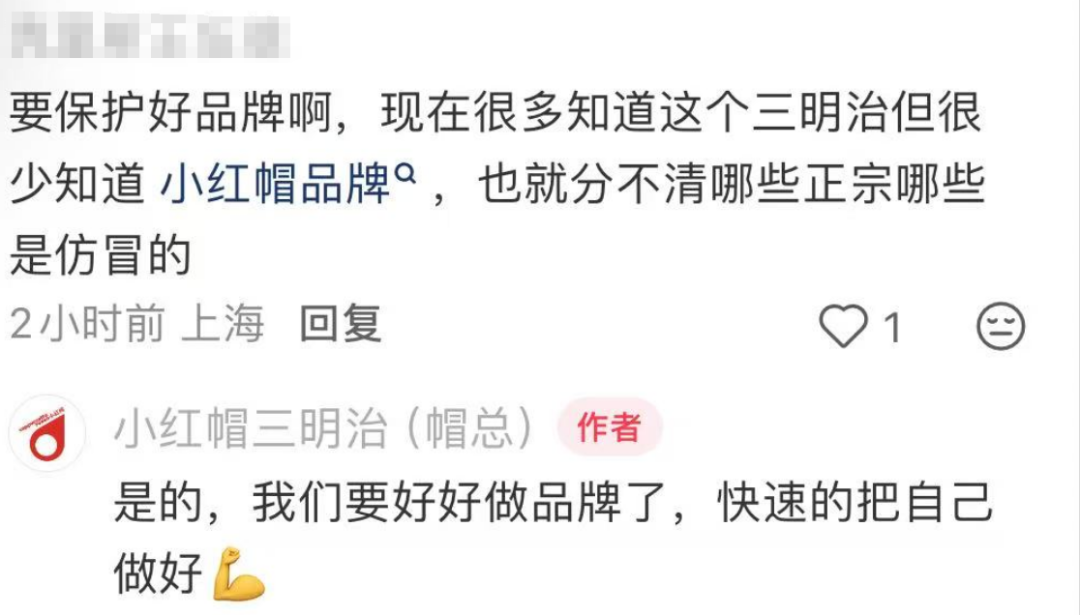 在帽总的账号评论区,有网友留言称现在很多人知道这个三明治,但不知道小红帽品牌,也就分不清哪些正宗哪些是仿冒的。帽总回应称:“是的,我们要好好做品牌了,快速地把自己做好”。