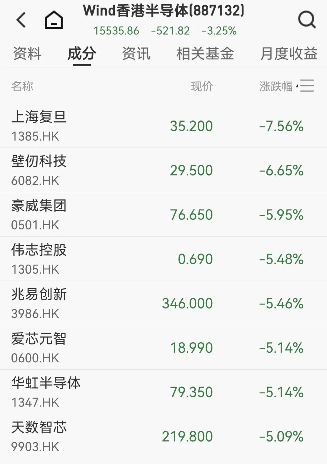 AI应用股领跌,智谱跌近15%,MINIMAX-W跌超10%。芯片股大跌,上海复旦跌超7%,华虹半导体跌超5%,中芯国际跌超3%。