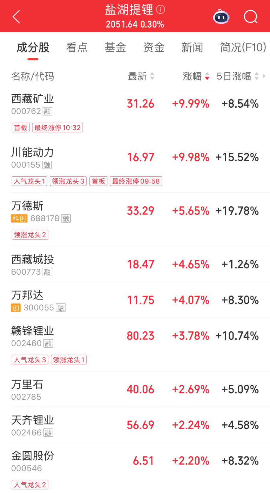 4月2日,盐湖提锂概念集体异动,川能动力直线拉涨停,报16.97元/股,封单一度超86万手,截至10:46,西藏矿业也封住涨停,万德斯、西藏城投、万邦达、赣锋锂业等多只概念股纷纷跟涨。