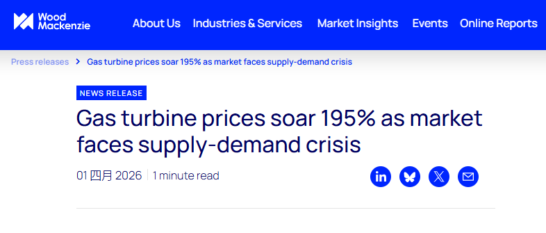 根据咨询机构伍德麦肯兹的一份最新报告,受电气化需求增长尤其是数据中心扩张的驱动,燃气轮机市场正面临严重的市场失衡,这将导致产品价格在2027年前持续飙升。