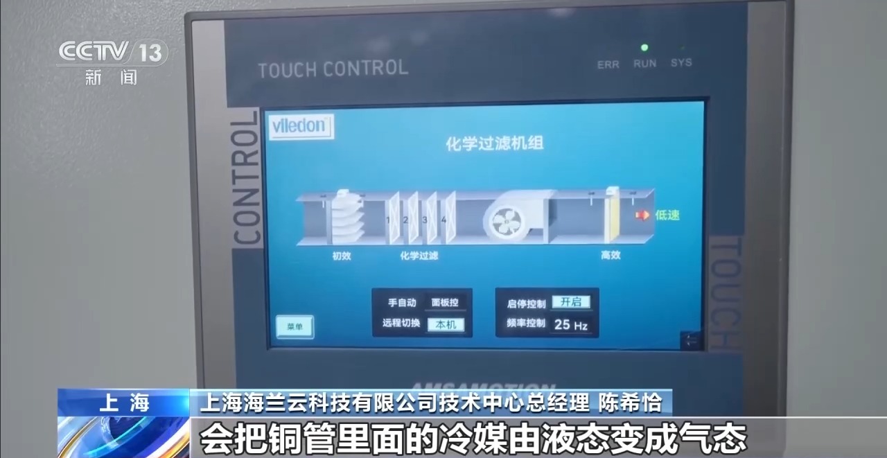 上海海兰云科技有限公司技术中心总经理 陈希恰:我们的背板空调将服务器产生的热空气抽过来,会把铜管里的冷媒由液态变成气态,就会通过它自身的浮力上升到上部组块的制冷层。在制冷层上与换热器通过海水进行热交换,由气态变成了液态。又通过重力的方式回到数据仓的机房当中,形成了无动力的热传递交换。