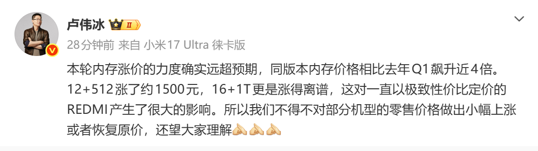 同日,小米集团总裁卢伟冰在微博发文回应表示,本轮内存涨价的力度确实远超预期,同版本内存价格相比去年Q1飙升近4倍。12+512涨了约1500元,16+1T更是涨得离谱,这对一直以极致性价比定价的REDMI产生了很大的影响。所以我们不得不对部分机型的零售价格做出小幅上涨或者恢复原价。