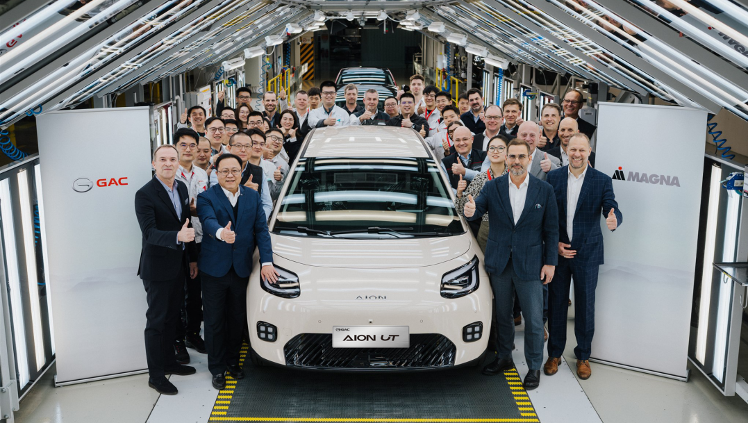 AION UT在奥地利生产基地下线,GAC欧洲团队与麦格纳团队合影