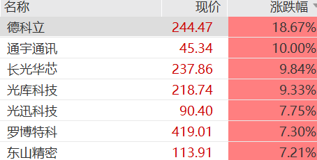 上涨方面,CPO强势领涨,德科立涨超18%,长光华芯、通宇通讯涨停。