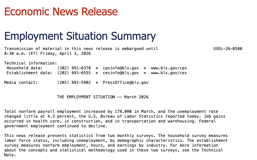 北京时间周五晚间,美国劳工统计局披露了一份整体好于事前预测的2026年3月非农就业报告。